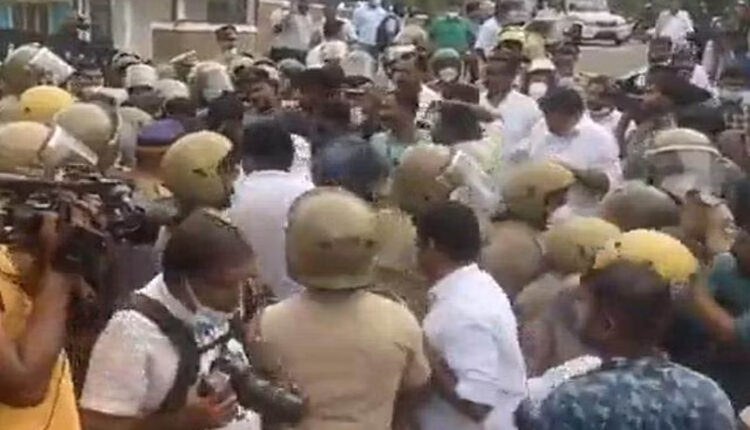 ഡൽഹി എകെജി ഭവനിലേക്ക് യൂത്ത് കോൺഗ്രസാണ് മാർച്ച് നടത്തുന്നത്. എറണാകുളം ഡിസിസി ഓഫീസിൽ നിന്ന് തുടങ്ങിയ കെ എസ് യു മാർച്ചിൽ മുഖ്യമന്ത്രി പിണറായി വിജയന്റെ പോസ്റ്റർ കത്തിച്ചു. റോഡിൽ ടയർ കത്തിച്ചും ഇവിടെ പ്രവർത്തകർ പ്രതിഷേധിച്ചു.
